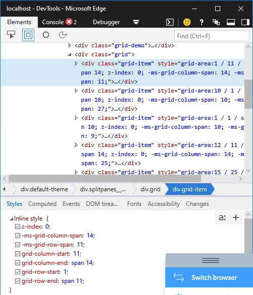 Now, here is the fun part. See what happens when we open the same website on Edge (v18, non-chromium). Vue.js is adding the grid-area property, but it also adds the individual (and prefixed) -ms-grid-<column/row>-span, grid-<column/row>-start and grid-<column/row>-end. So everything appears correctly in the grid #magic.